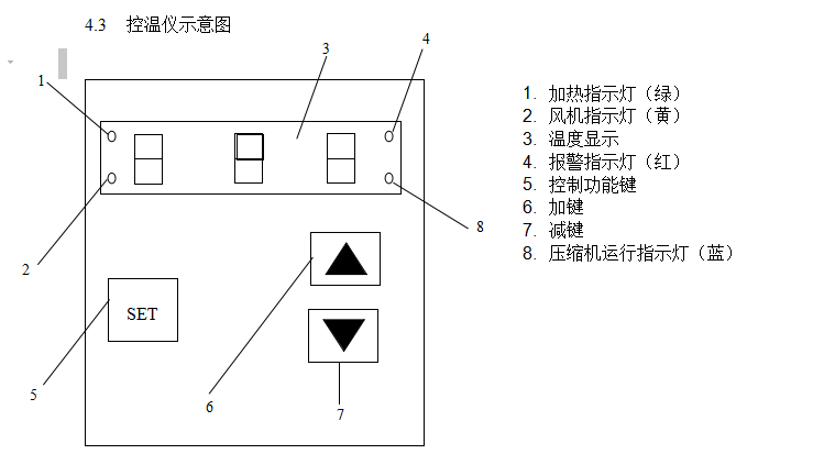 4.5.1.5 按一下“SET”鍵確認設定溫度,新溫度設定后,這時控溫儀就轉換為顯示箱內實際溫度。